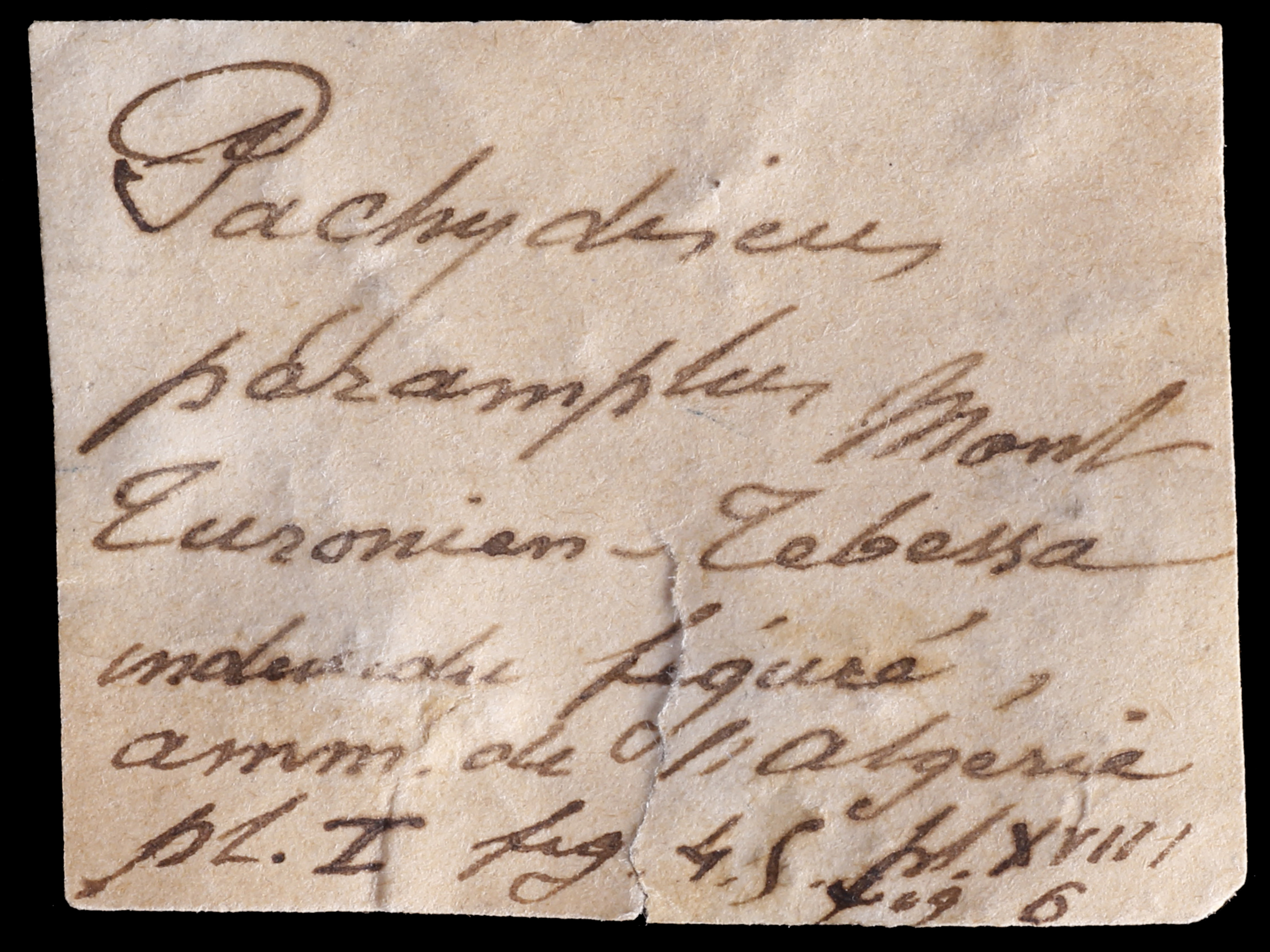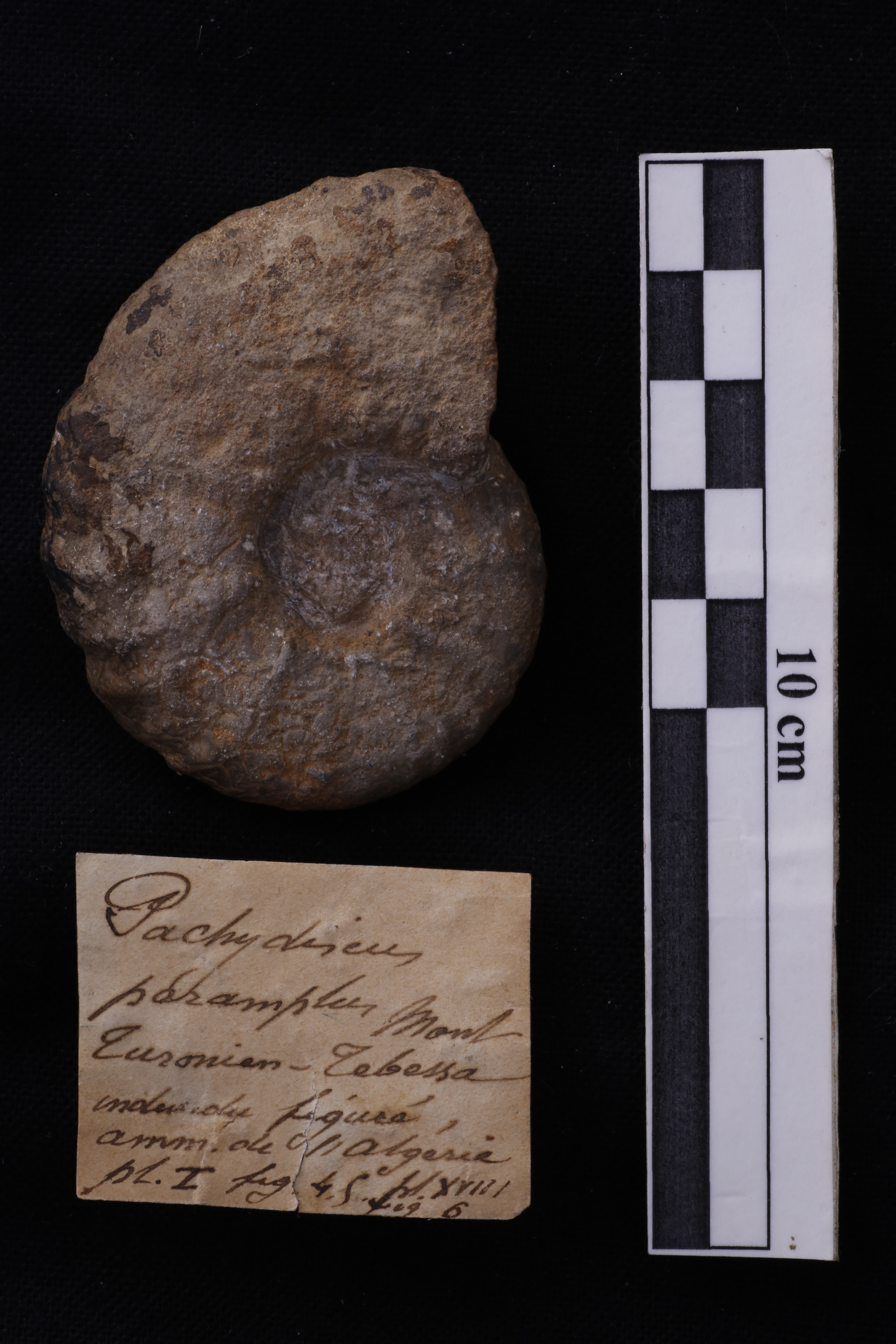 Pachydiscus peramplus (Mantell, 1822) Par Alphonse Péron (1896) (Les Ammonites du Crétacé supérieur de l’Algérie. Figuré : Pages 42-43, Planche I, figures 4 et 5 ; Planche XVIII, figure 6)
