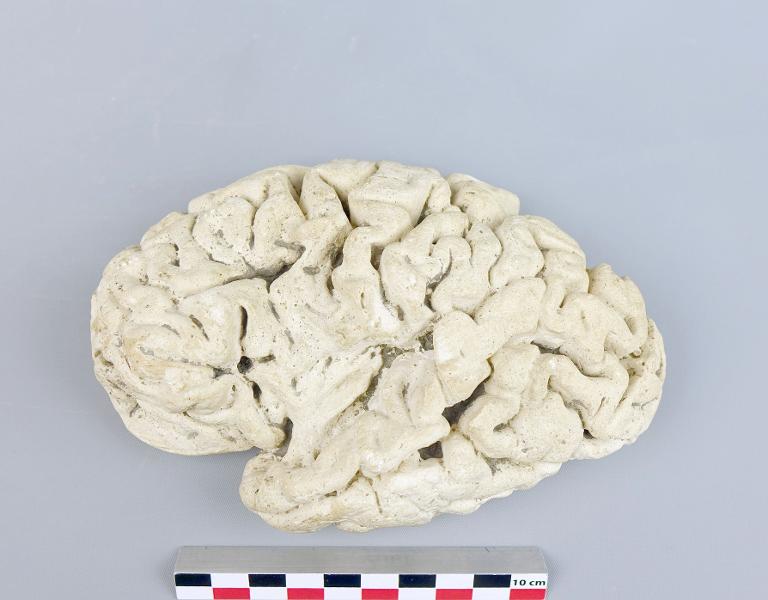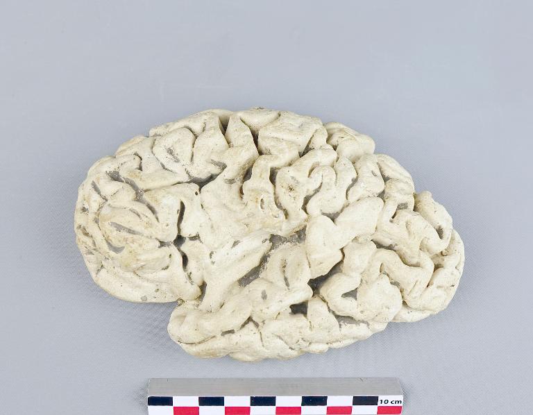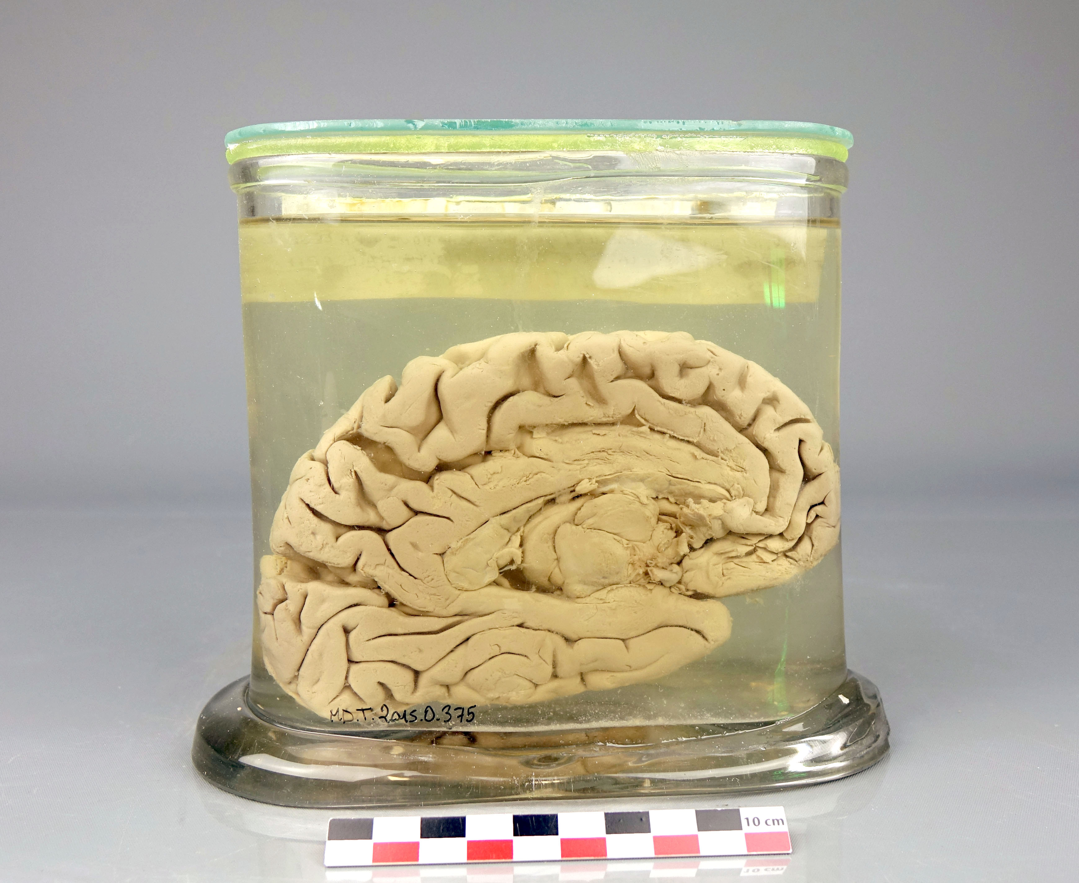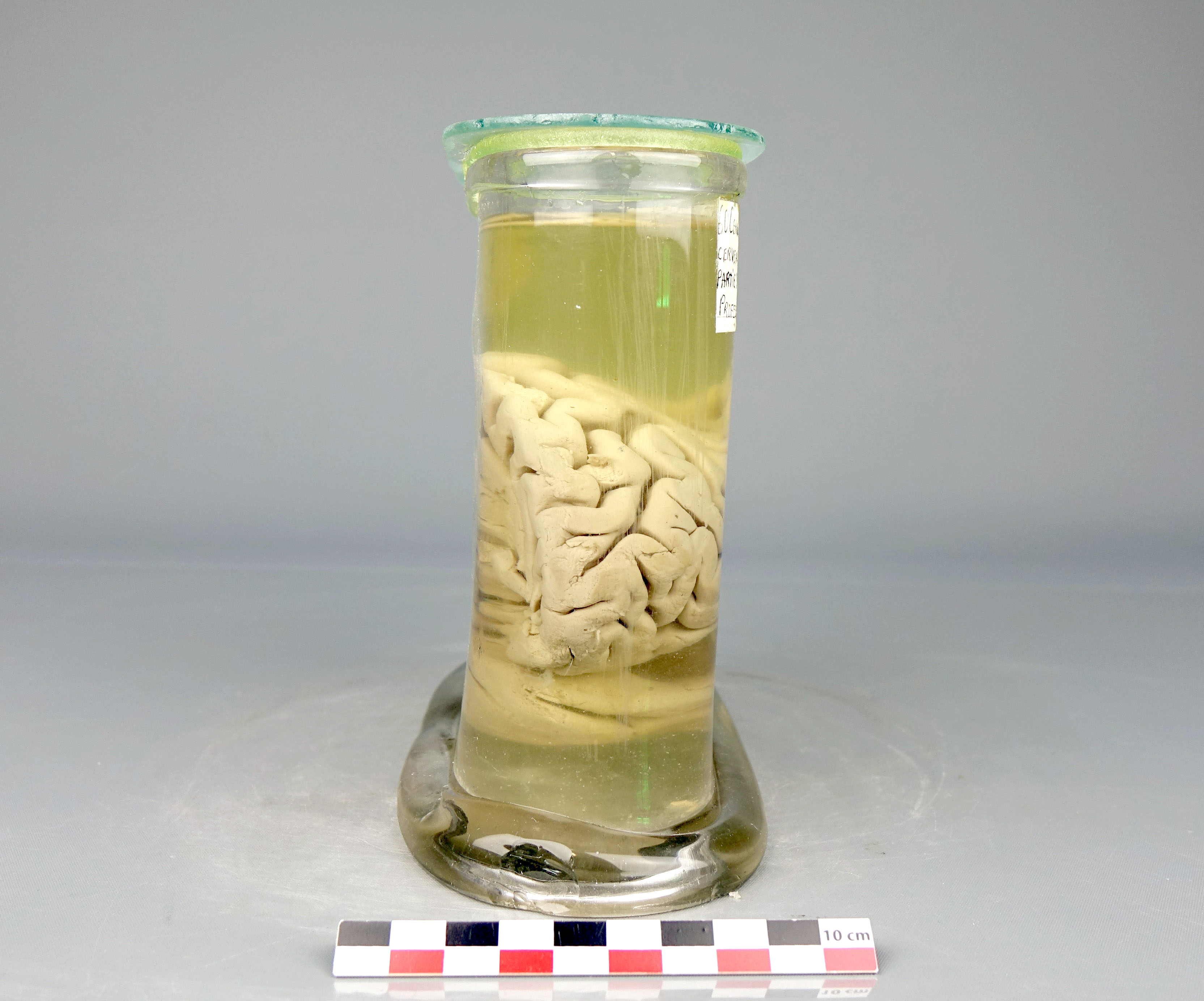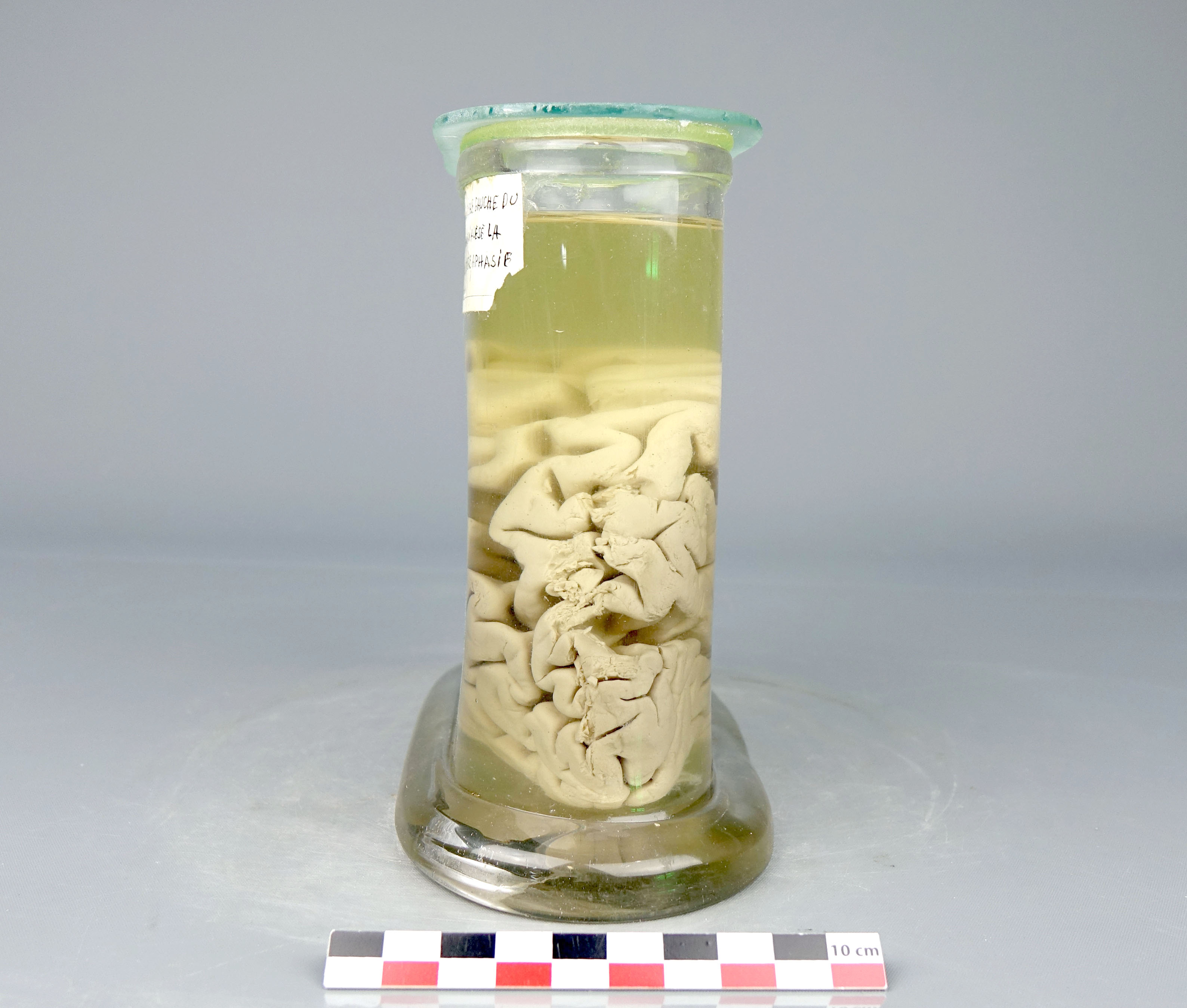 Gravé sur le couvercle : "Lh45 – 181" - Étiquette : "60. Cerveau du nommé Lelong âgé de 84 ans. Moitié latérale gauche du cerveau, cicatrice d'un ancien foyer hémorragique qui a lésé la partie postérieure de la 2ème et 3ème circonvolution frontale; aphasie. Professeur Broca (cat. Houel T.3 page 276, N°60."