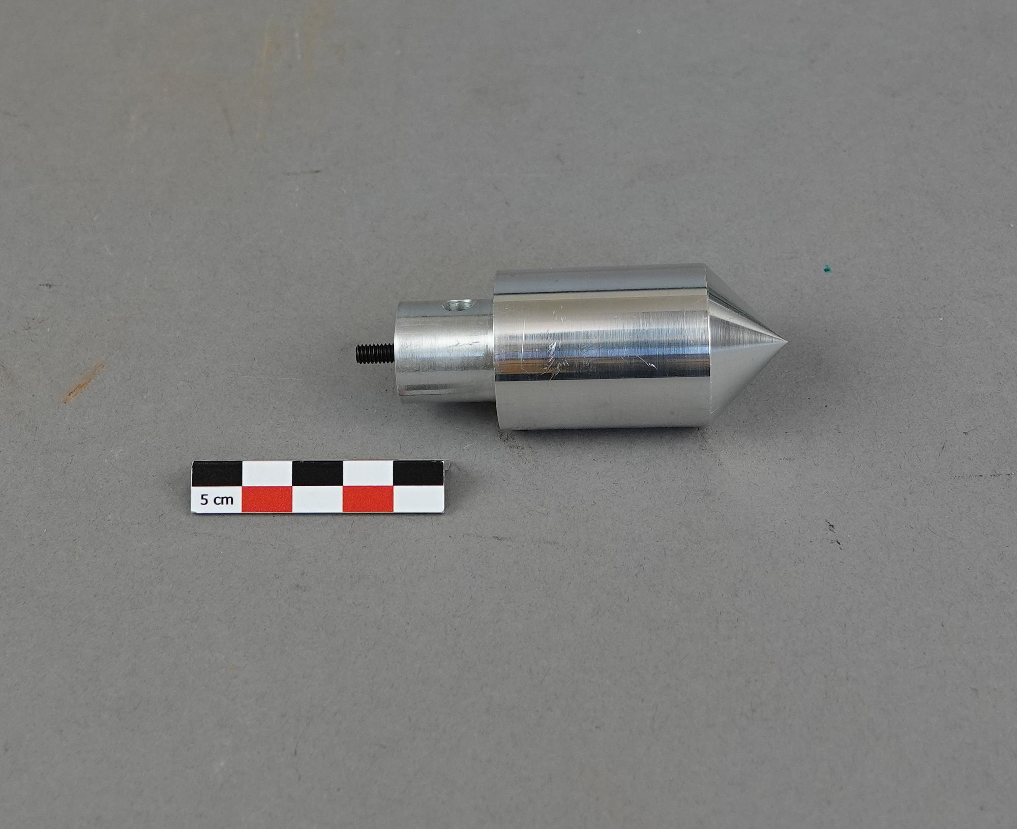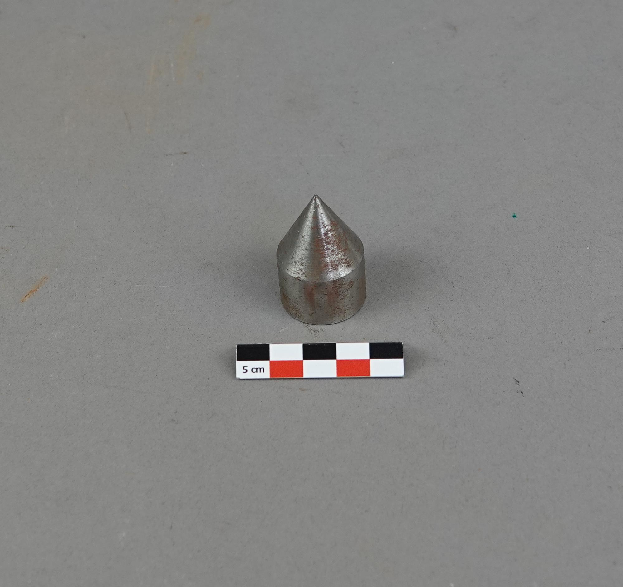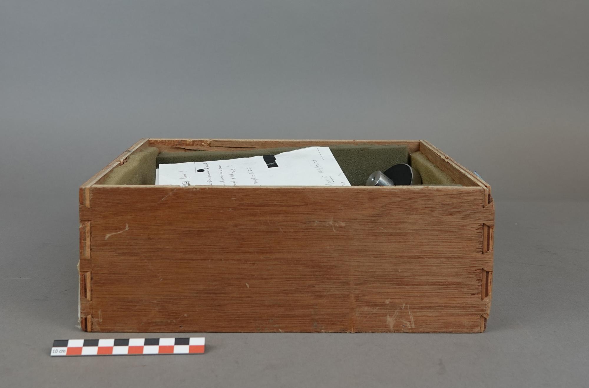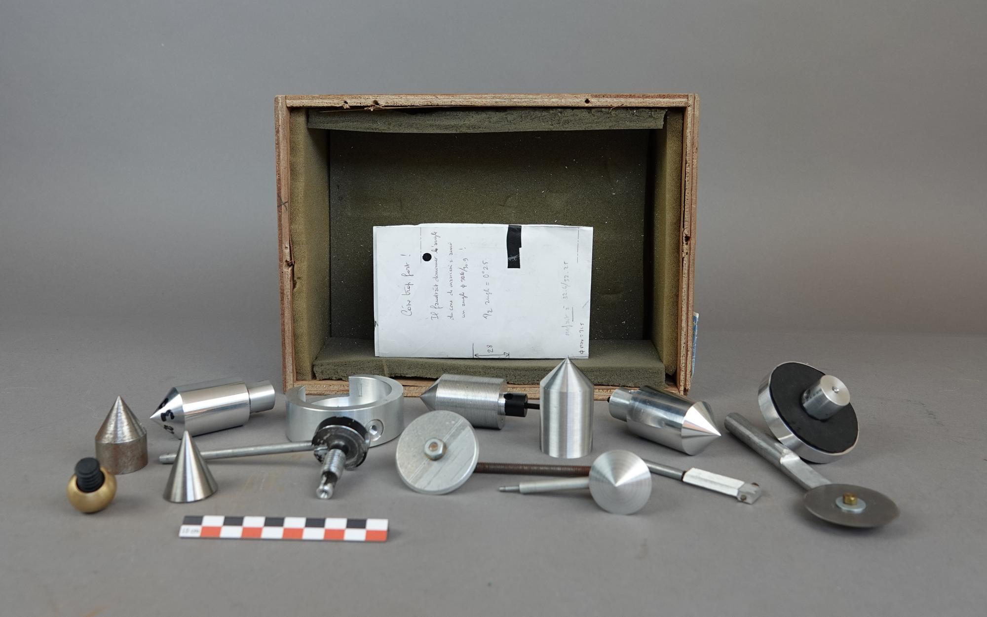 Boîte en bois doublé de mousse avec 14 cônes tous différents. Avec il y a une feuille papier manuscrite avec des schémas et des calculs.