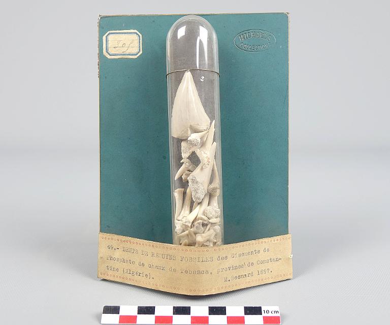 Fiole en verre montée sur planche, présentant des dents fossiles de requins des gisements de phosphate de chaux de Tebesca, province de Constantine