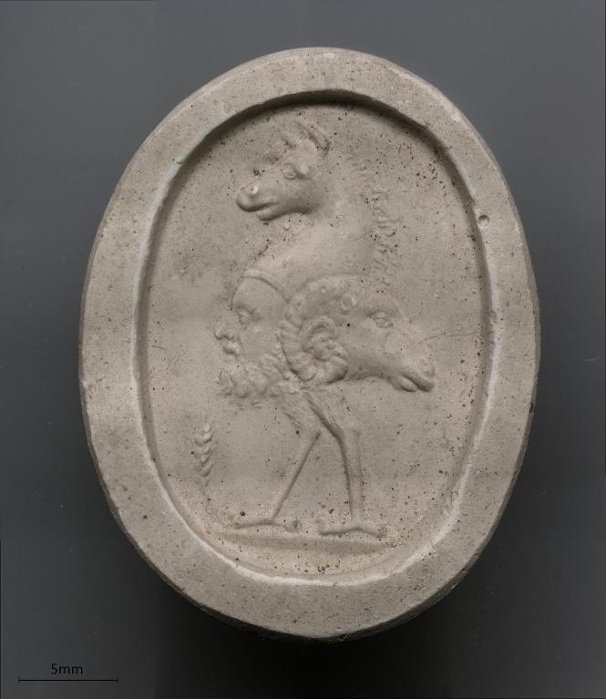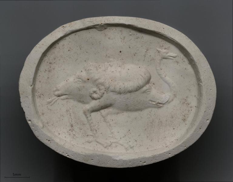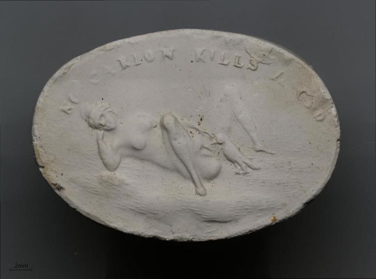 Moulage d’intaille représentant une femme nue allongée face à un oiseau.