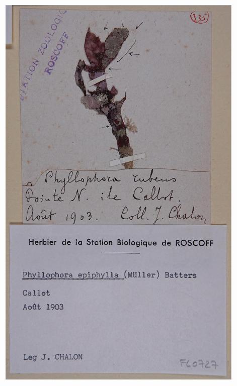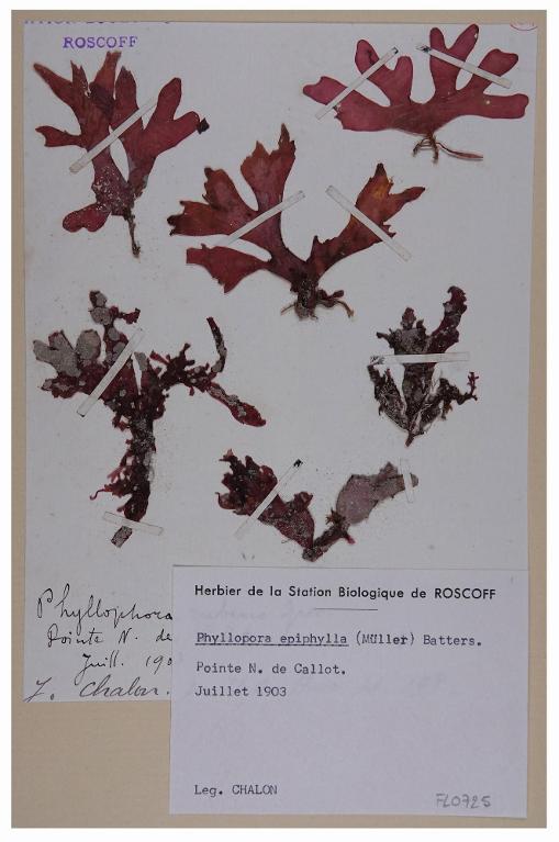 Domaine : BotaniqueIdentification du spécimen : Phyllophora epiphyllaCollections : Station Biologique de RoscoffFonds : Chalon, Jean