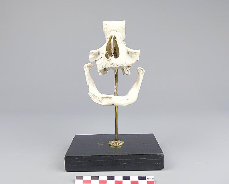 Portion avant d’un crâne et mandibule sénile avec découpes anatomiques du processus alvéolaire et de la base droite, hors foramen mentonnier