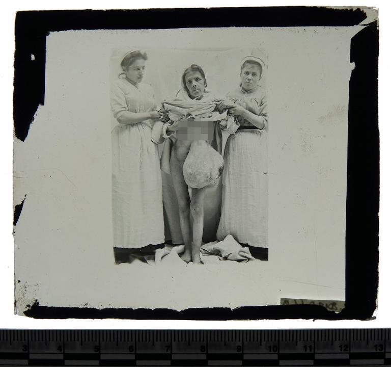Plaque photographique représentant une femme atteinte d’une tumeur géante au torse