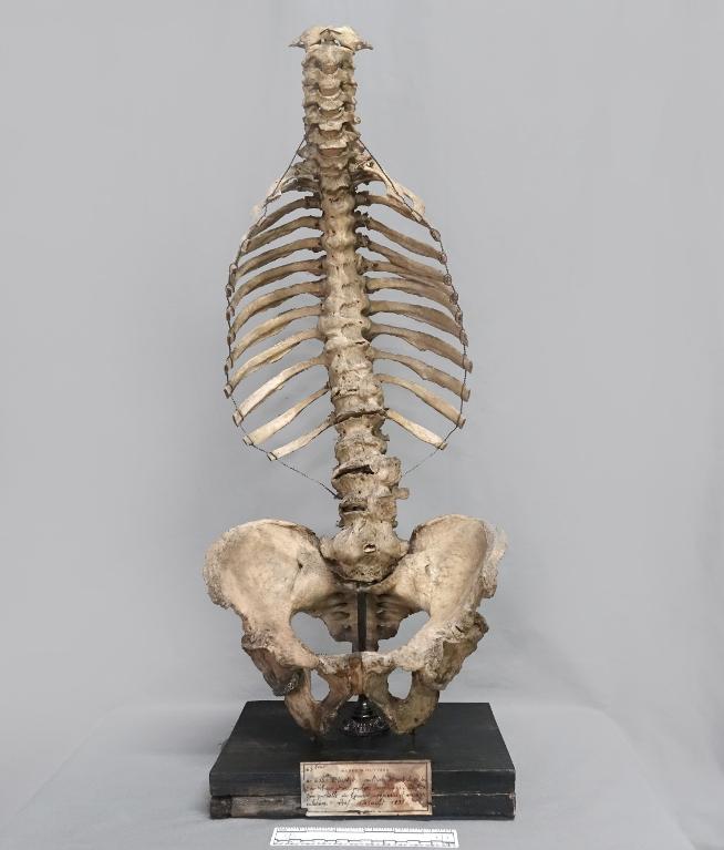 Colonne vertébrale complète, avec portion de la base du crâne et bassin incomplet, présentant une cyphose de la région dorso-lombaire
