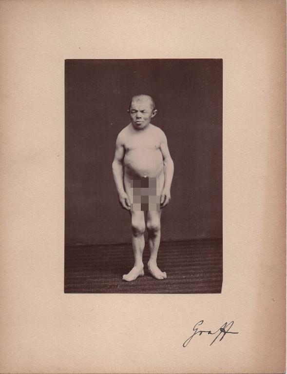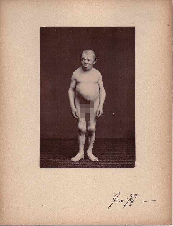 Photographie clinique représentant un homme atteint de nanisme myxoedémateux et d’une hernie inguino-scrotale