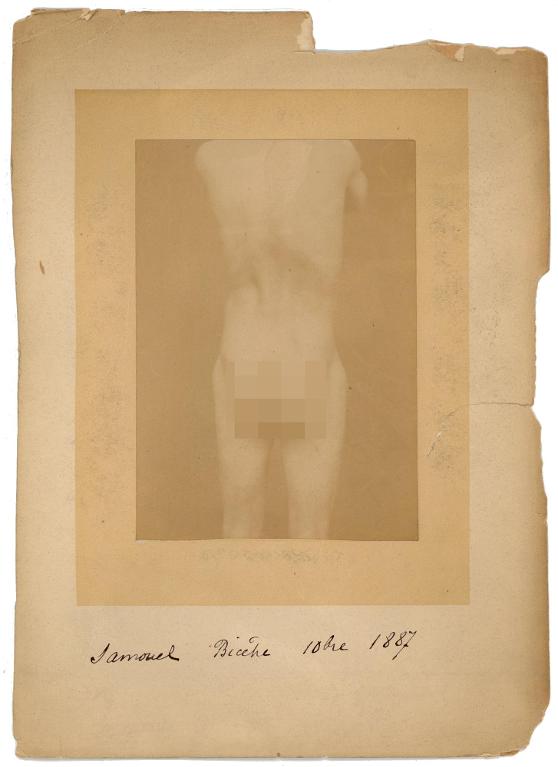 Photographie clinique représentant un homme debout, profil gauche, atteint d’une pathologie indéterminée