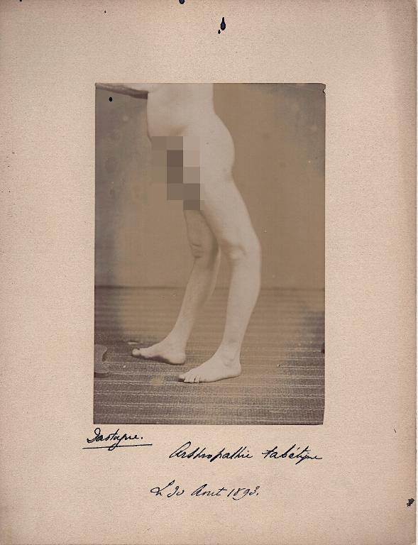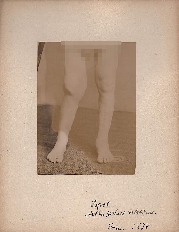 Photographie clinique représentant les jambes d’un homme atteint d’arthropathie tabétique