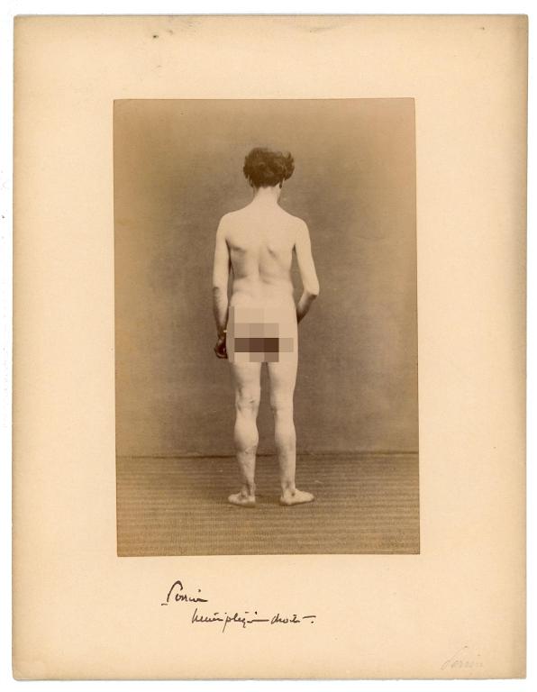 Photographie clinique représentant un homme debout, vue côté droit, présentant une hémiplégie droite