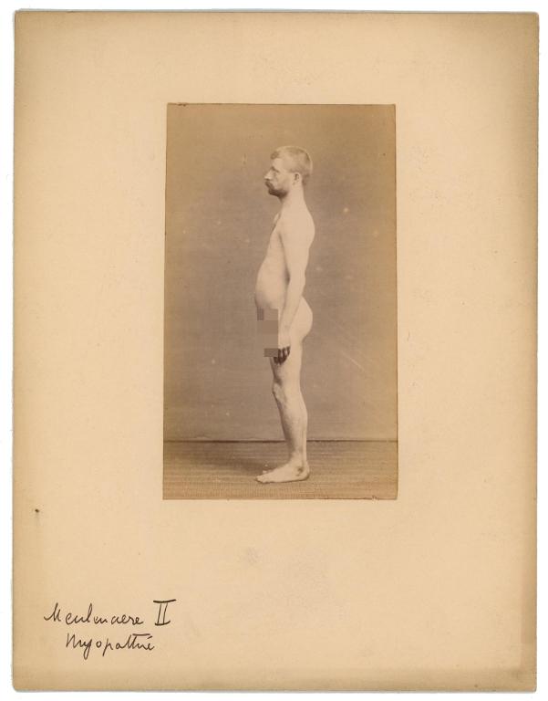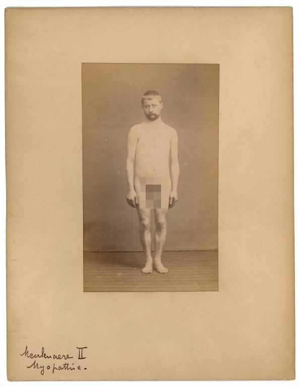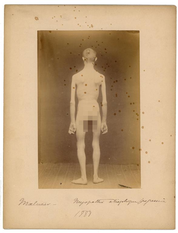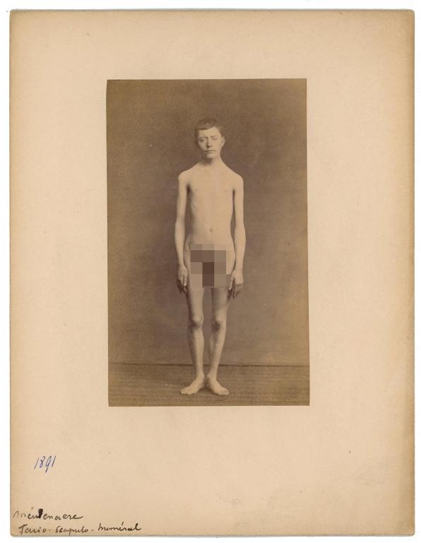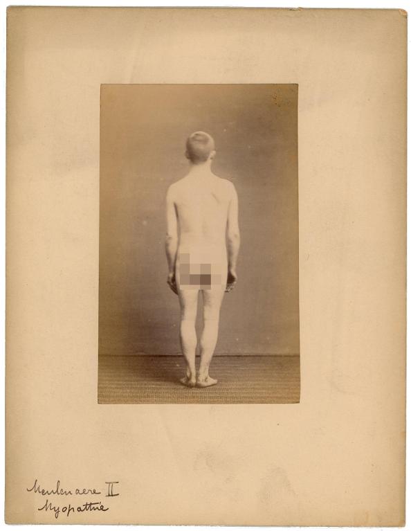 Photographie clinique représentant un jeune homme debout, de profil, atteint de myopathie