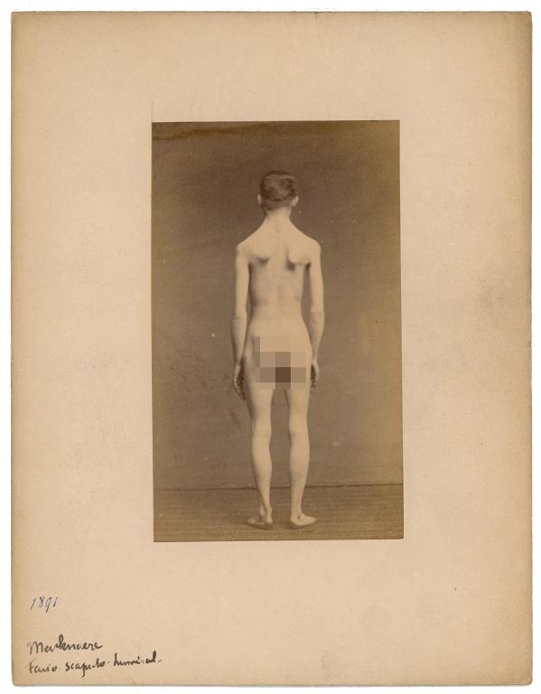 Photographie clinique représentant un jeune homme debout, de dos, atteint de myopathie facio-scapulo-humérale