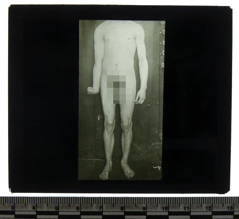 Plaque photographique représentant un homme debout avec une crispation de la main