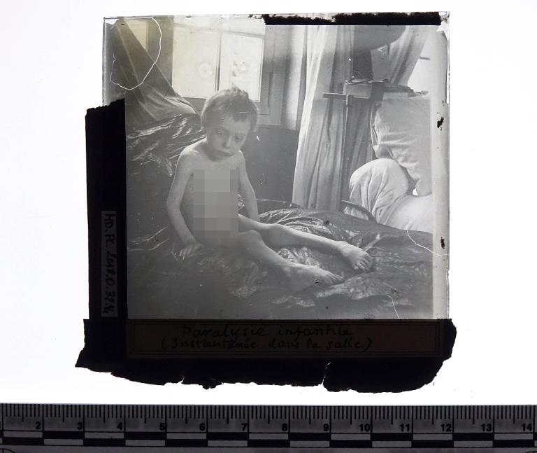 Plaque photographique représentant un enfant atteint de paralysie infantile