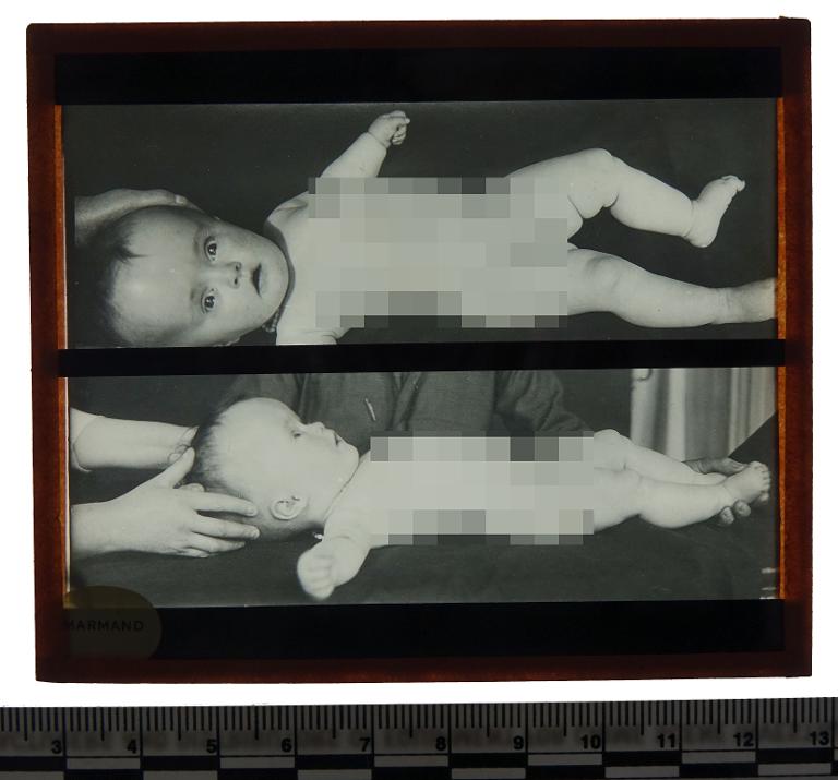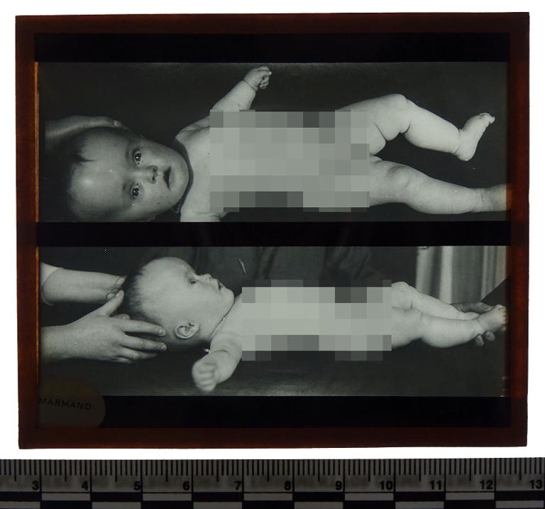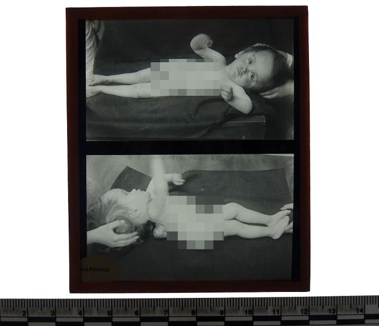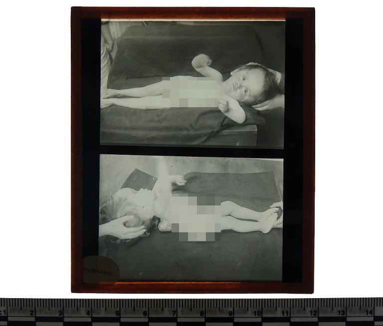 Plaque photographique : reproduction d’une photographie publiée représentant un enfant atteint d’un spina bifida