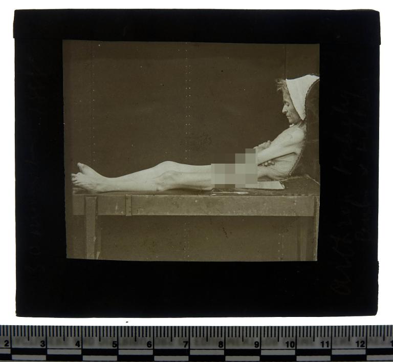 Plaque photographique représentant le corps d’une femme décédée (pathologie indéterminée)