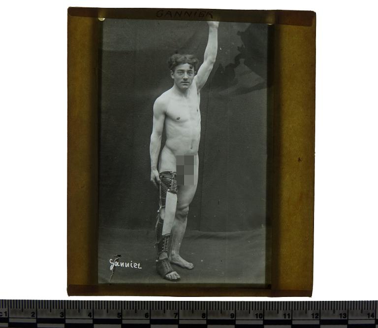 Plaque photographique représentant un homme debout, bras gauche en l’air et s’appuyant de sa main droite sur une prothèse articulée agencée sur sa jambe droite
