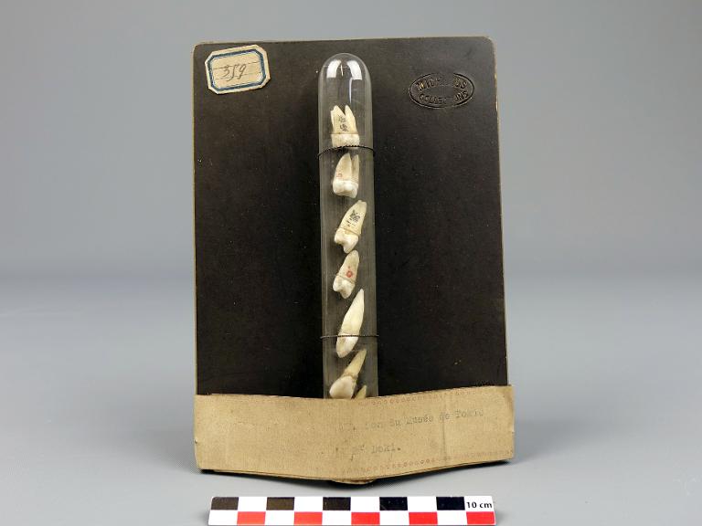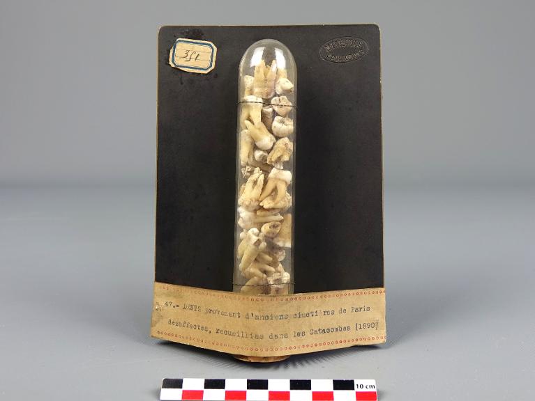 Fiole en verre montée sur planche, présentant des dents provenant d’anciens cimetières de Paris, recueillies dans les catacombes