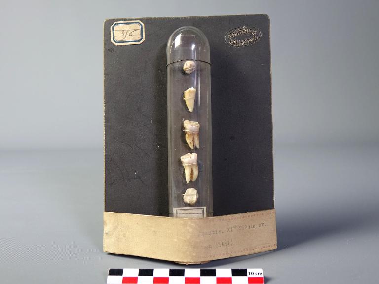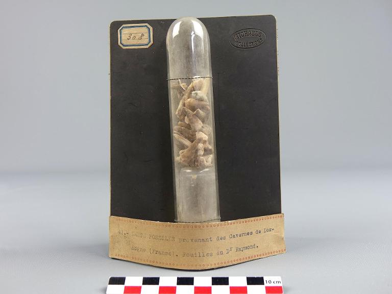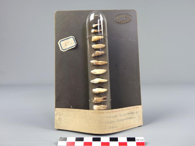Fiole en verre montée sur planche, présentant des dents provenant des cavernes de Dordogne
