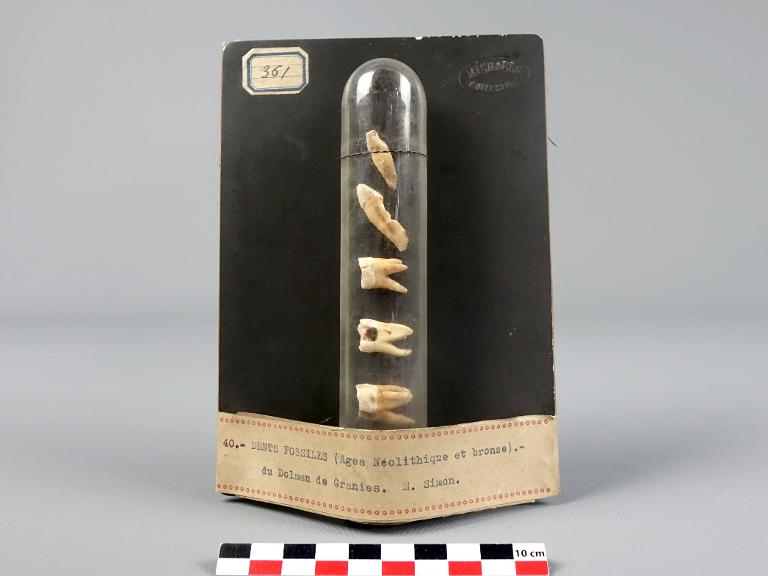 Fiole en verre montée sur planche, présentant des dents fossiles du dolmen de Graniès