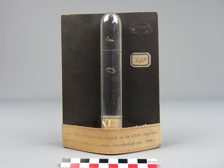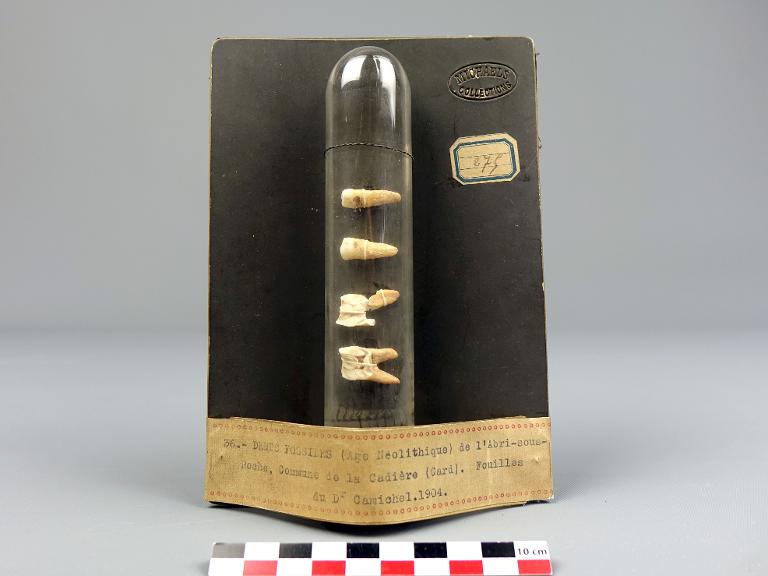 Fiole en verre montée sur planche, présentant des dents fossile provenant de l’Abri-sous-Roche, commune de la Cadière