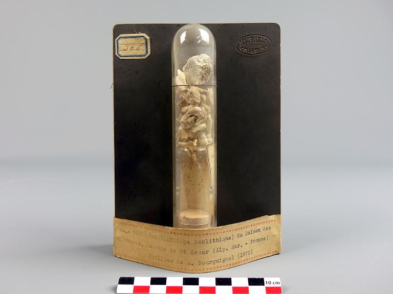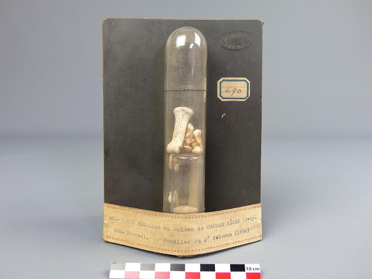 Fiole en verre montée sur planche, présentant des dents fossiles du dolmen de César