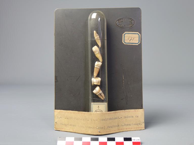 Fiole en verre montée sur planche, présentant des dents fossiles provenant du dolmen de Busareingues