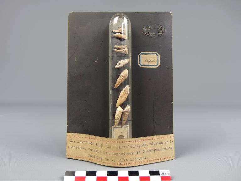 Fiole en verre montée sur planche, présentant des dents fossiles provenant de la station de la Madeleine, commune de Laugerie-Basse