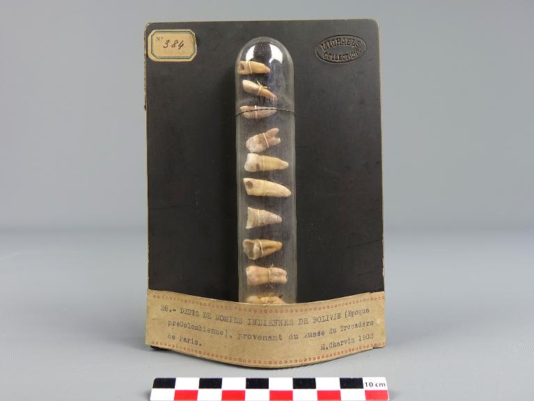 Fiole en verre montée sur planche, présentant des dents de momies boliviennes provenant du Musée du Trocadéro de Paris