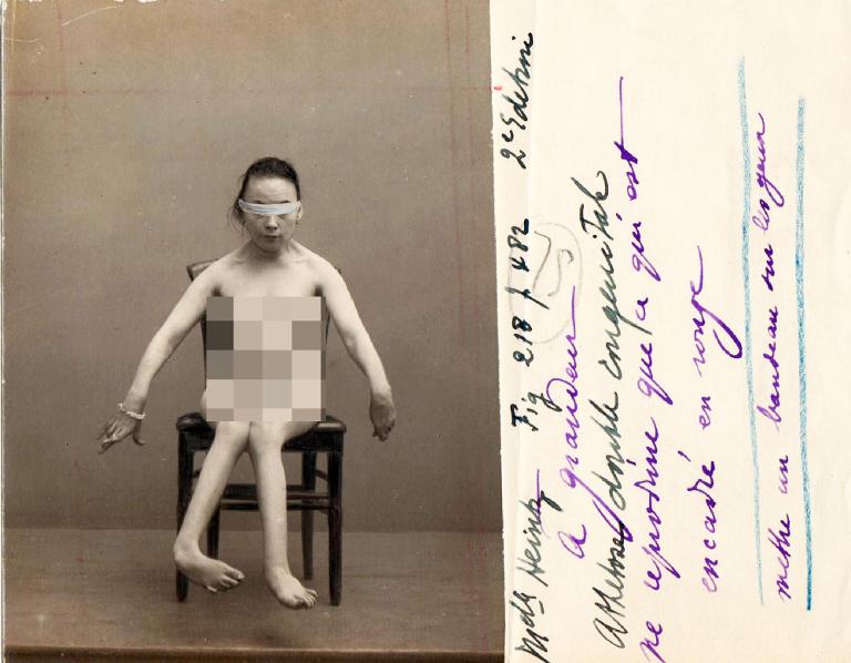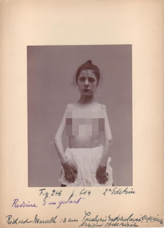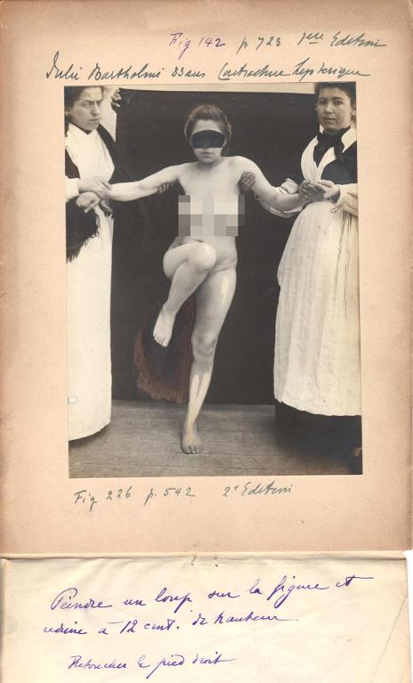 Photographie clinique représentant une jeune femme atteinte de contracture hystérique maintenue par deux infirmières