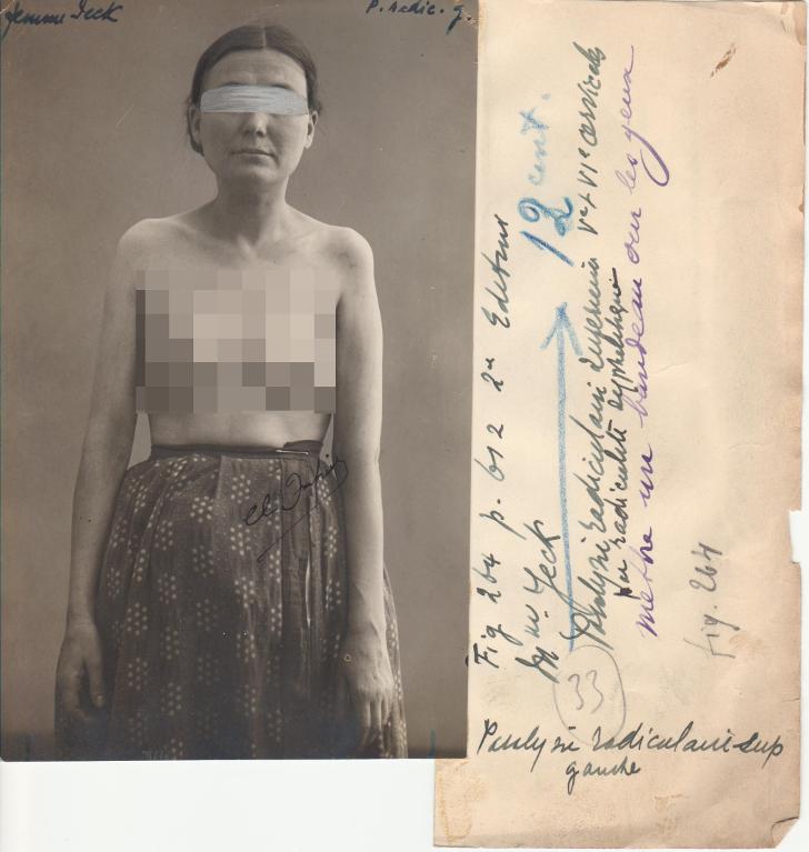 Photographie clinique représentant une femme atteinte d’une syringomyélie unilatérale avec hemiatrophie faciale à troubles oculo-pupillaires