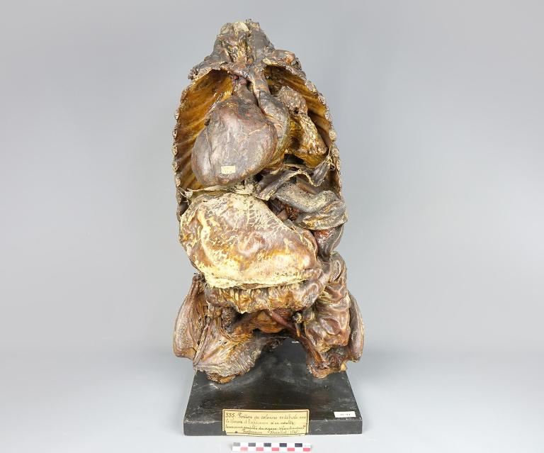 Portion de rachis avec trois côtes présentant une fracture de la 10ème côte avec cal allongé et légèrement noueux