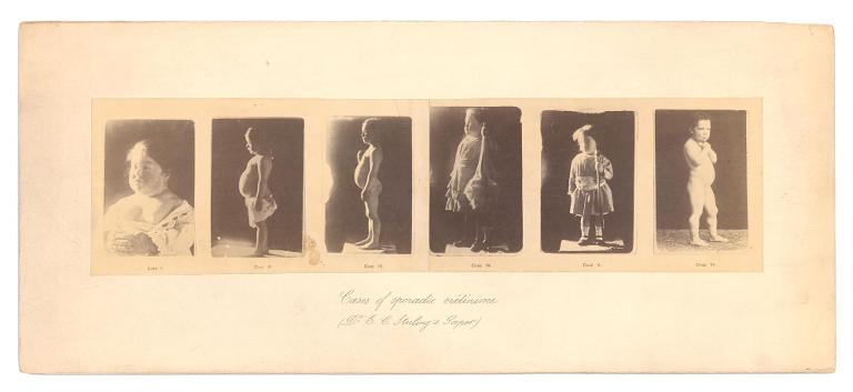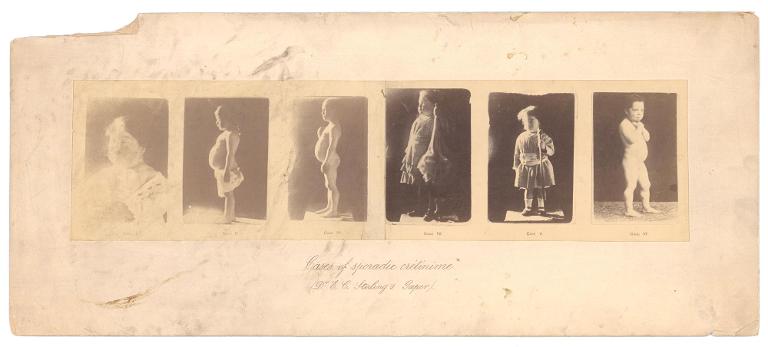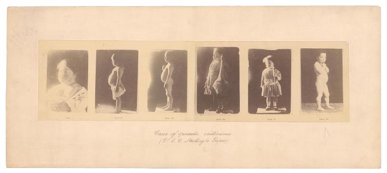 Planche de photographies cliniques de cas de crétinisme sporadique présentant trois enfants