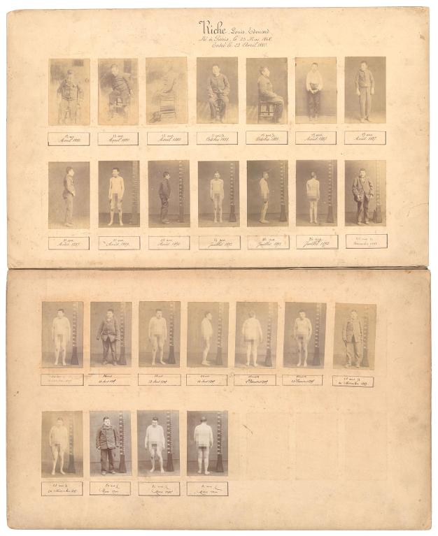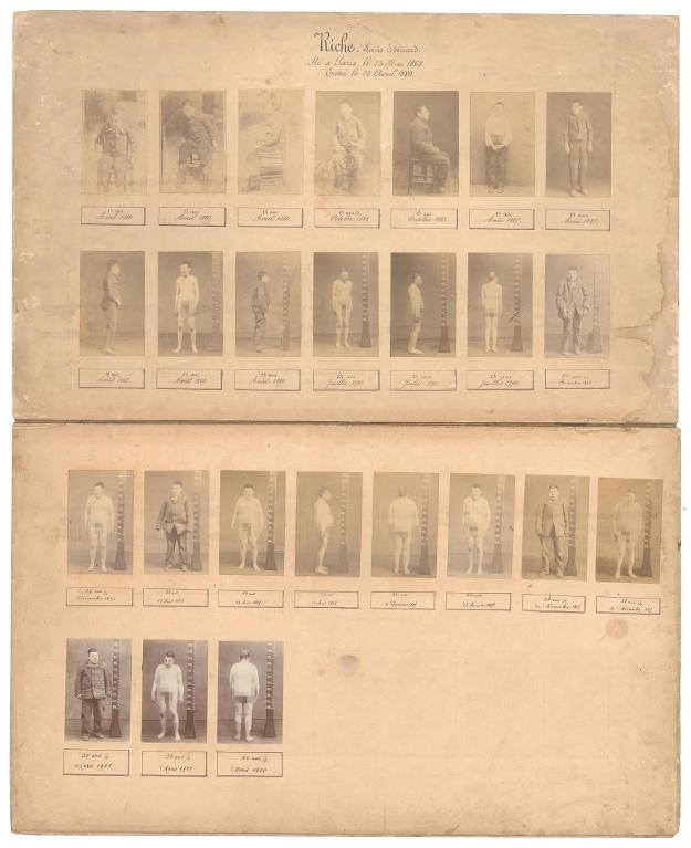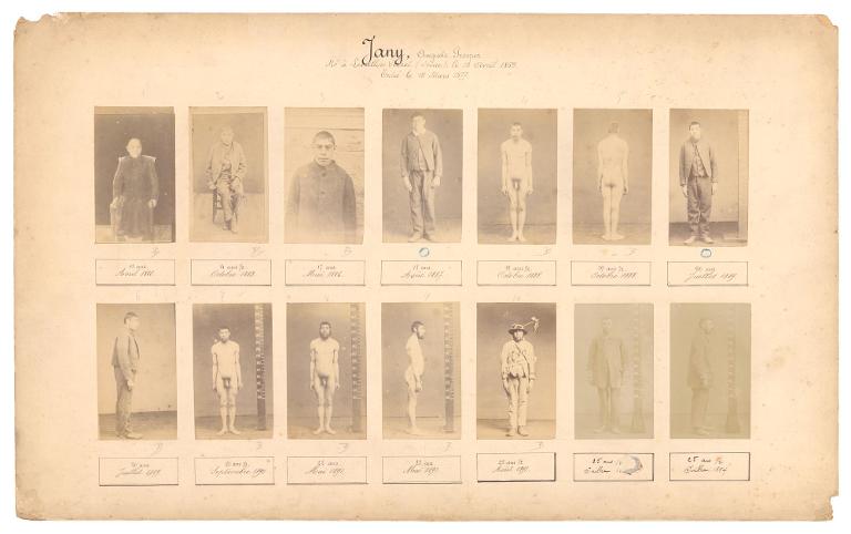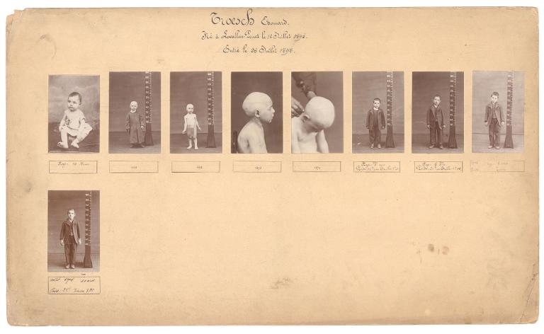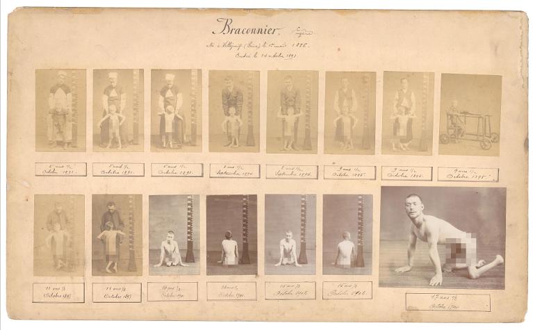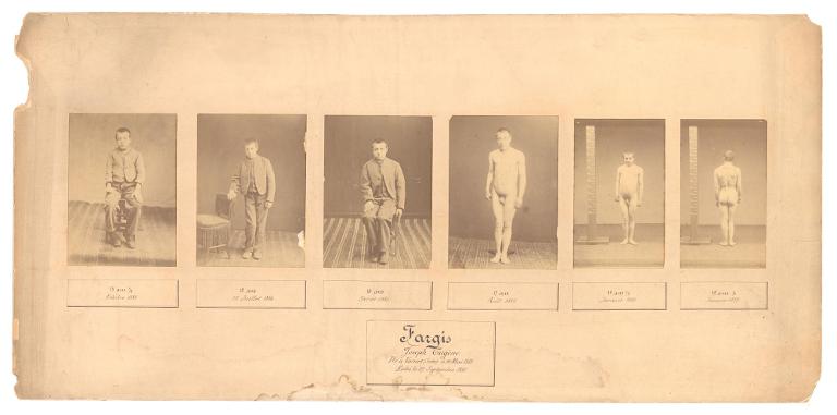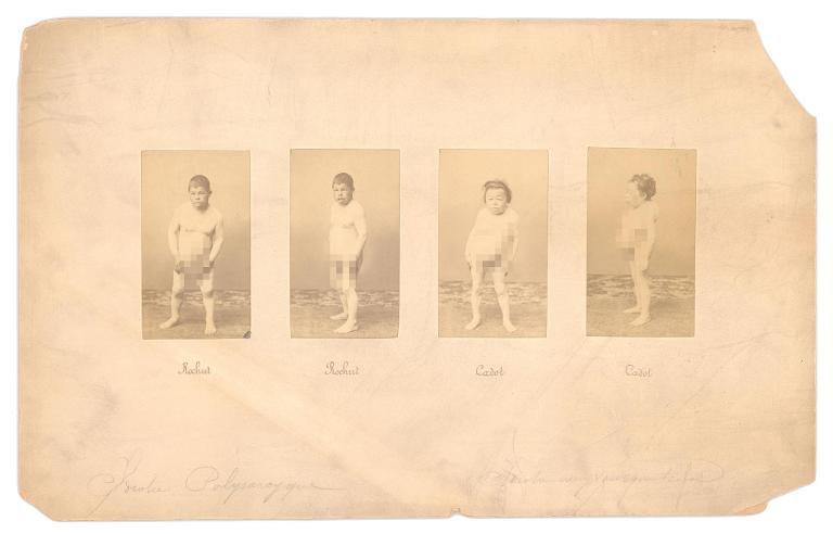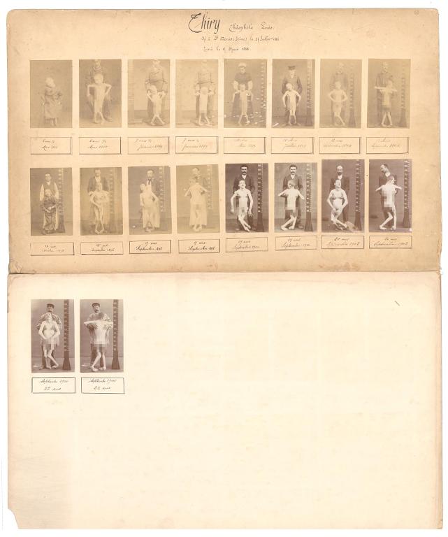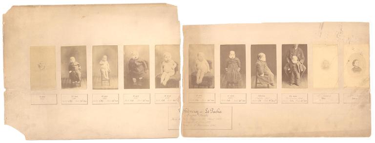 Planche de photographies cliniques du cas Thénéry dit Le Pacha, décrit comme présentant une idiotie, du crétinisme, et une cachexie pachydermique