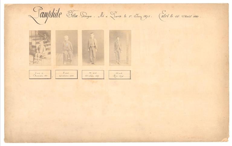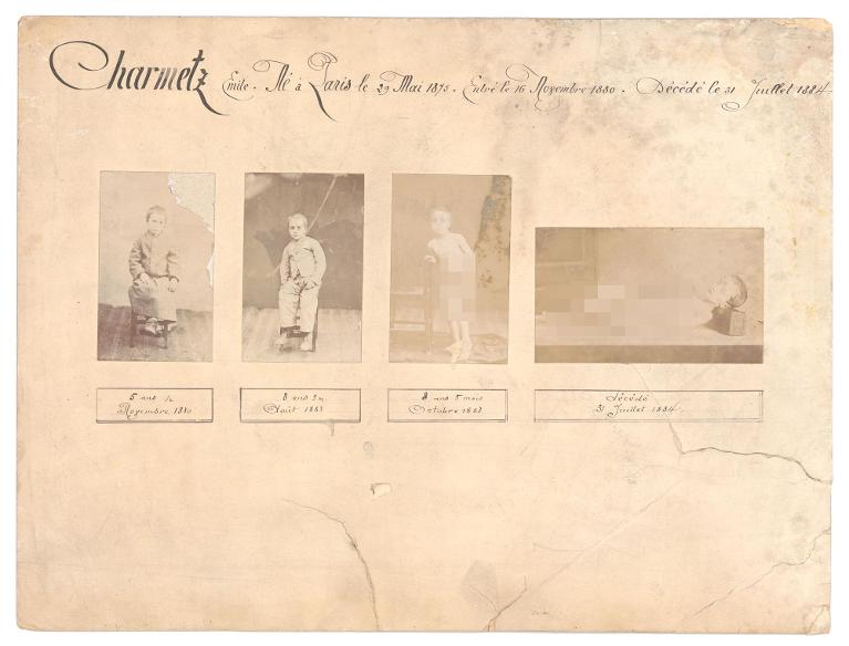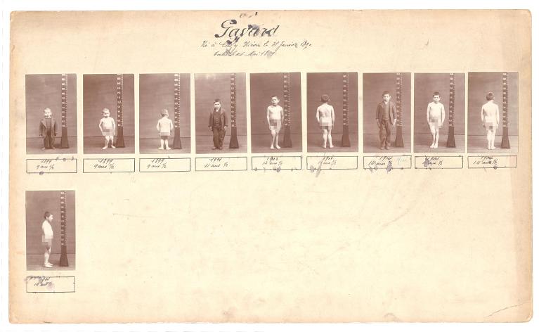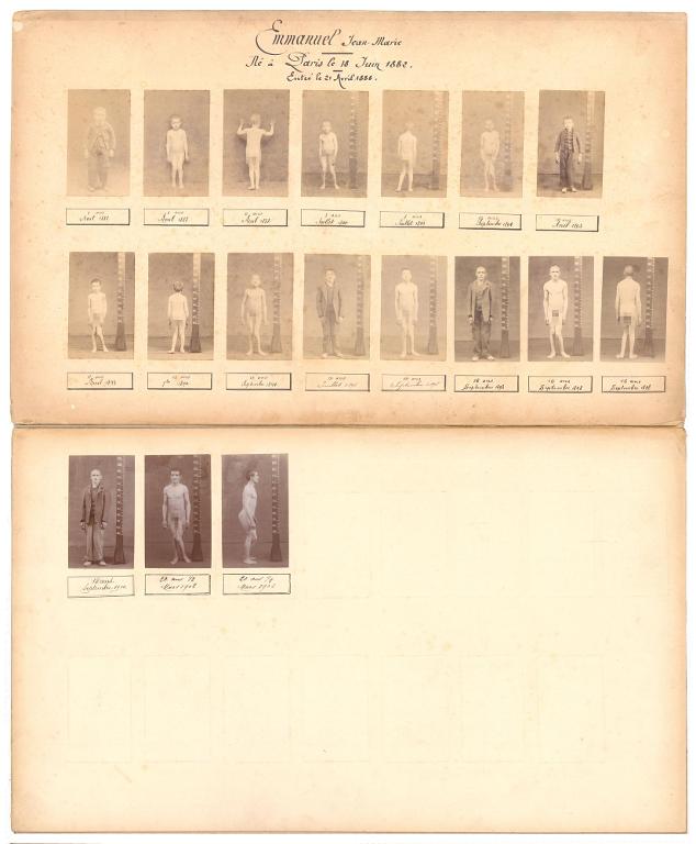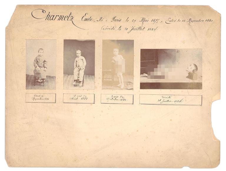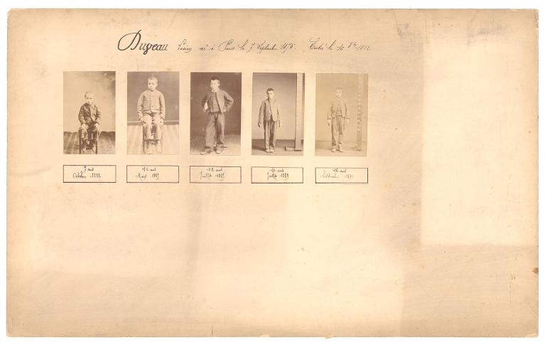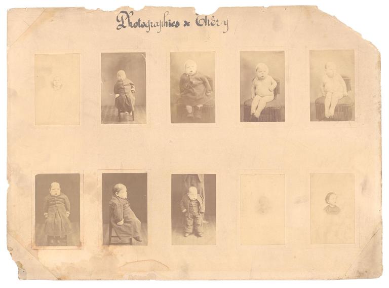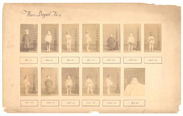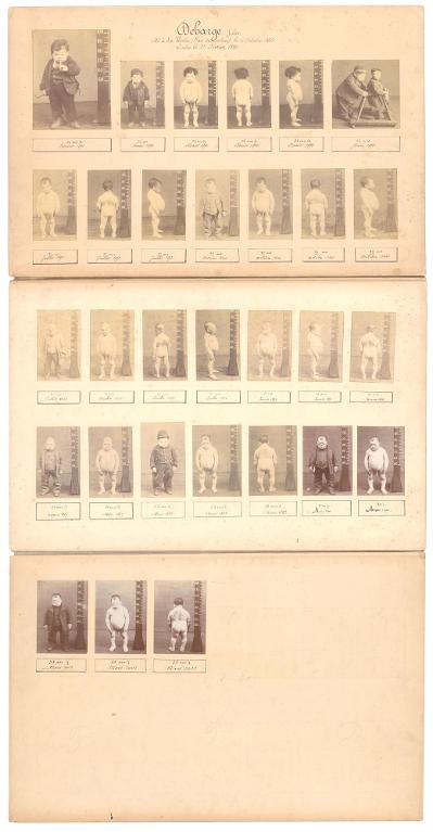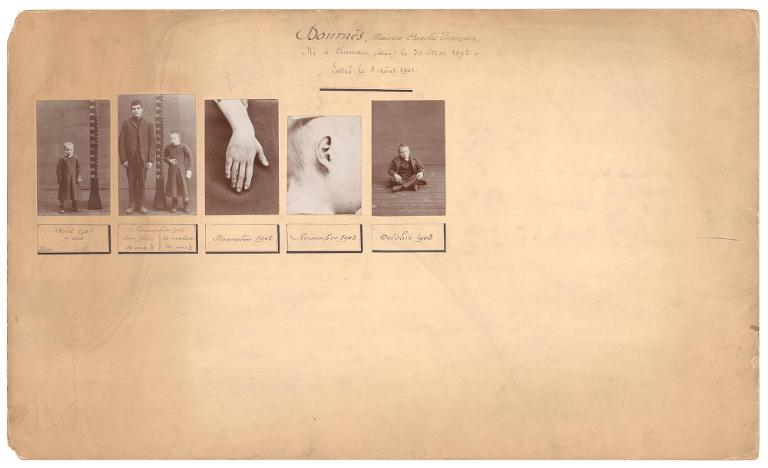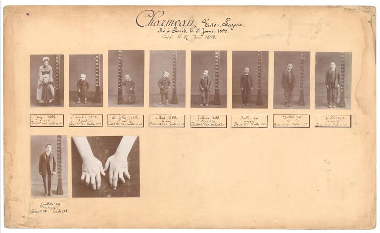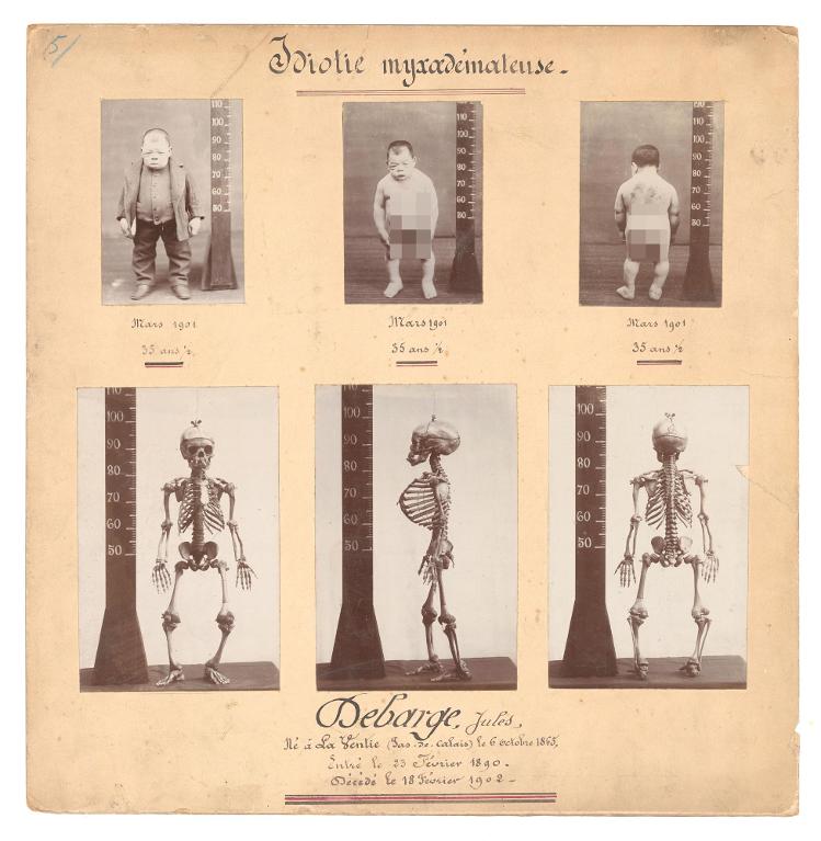 Planche de photographies cliniques du cas Debarge, décrit comme présentant une idiotie myxœdémateuse avec cachexie pachydermique