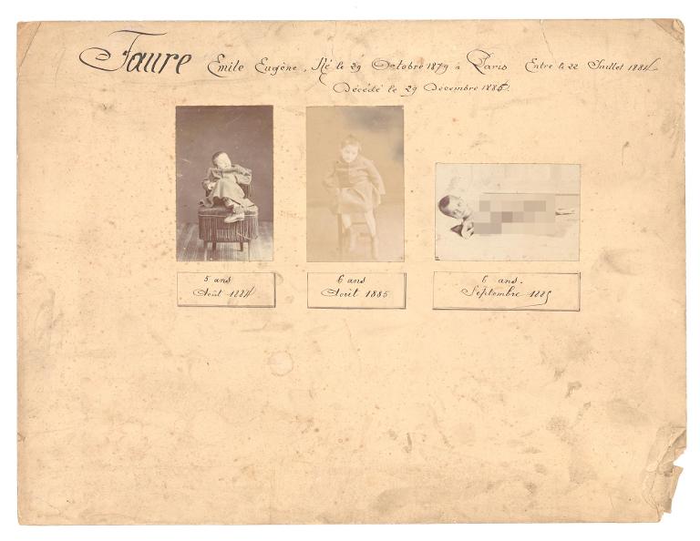 Planche de photographies cliniques du cas Faure, décrit comme présentant une hydrocéphalie partielle, idiotie complète et de l’épilepsie