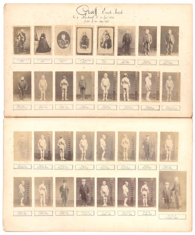 Planche de photographies cliniques du cas Graff présentant un nanisme myxoedémateux et une hernie inguino-scrotale