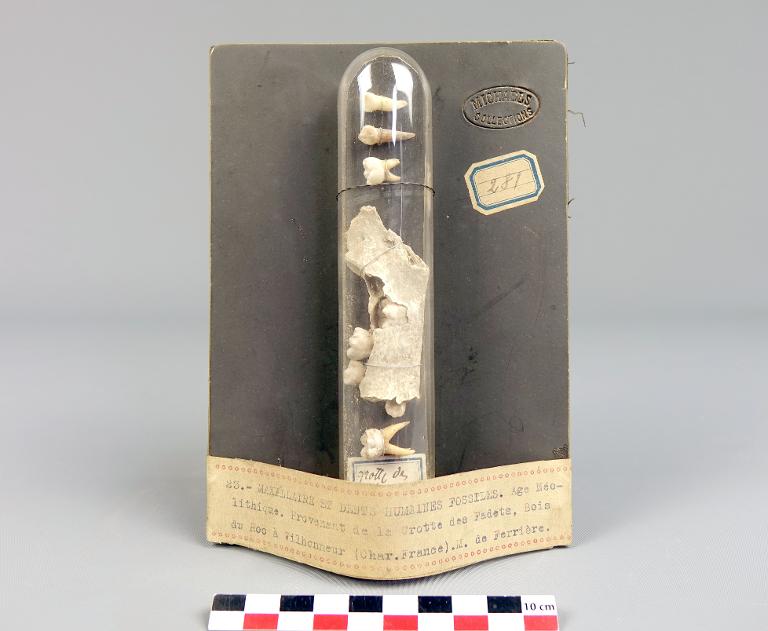 Fiole en verre montée sur planche, présentant une fiole contenant une portion de mandibule et des dents humaines fossiles datant du néolitique