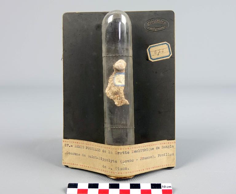 Fiole en verre montée sur planche, présentant des dents fossiles provenant de la grotte néolithique du Sangle dans le Doubs