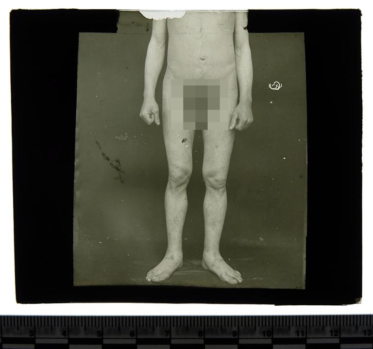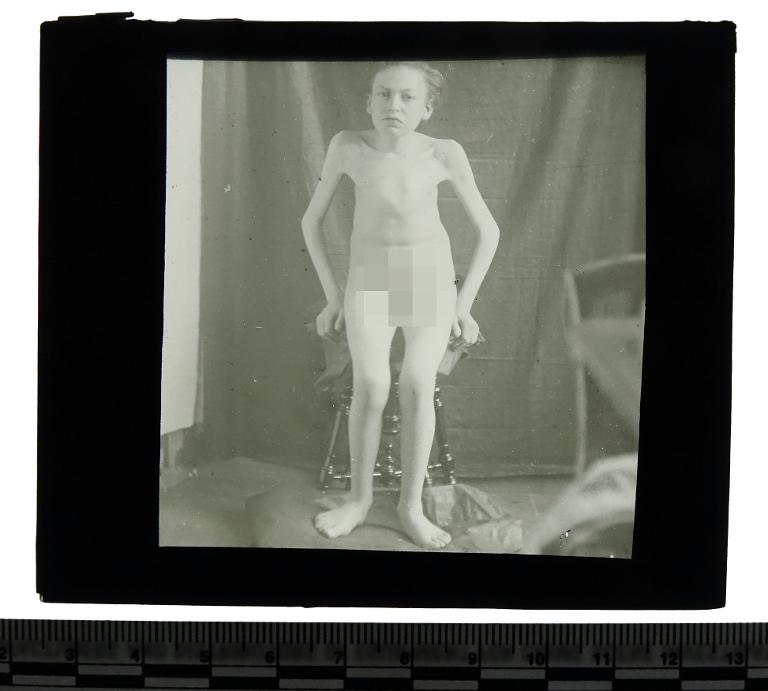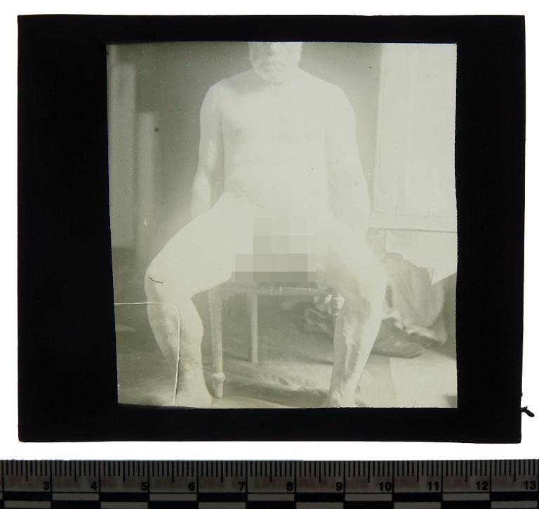 Plaque photographique représentant un jeune homme nu assis sur un tabouret