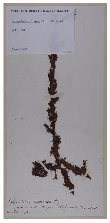 Domaine : BotaniqueTypologie : HerbierIdentification du spécimen : Sphacelaria cirrosaFonds : Chalon, Jean
