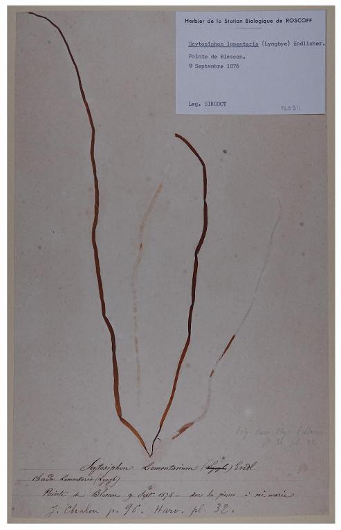Domaine : BotaniqueTypologie : HerbierProvenance géographique : BlosconIdentification du spécimen : Scytosiphon lomentarium