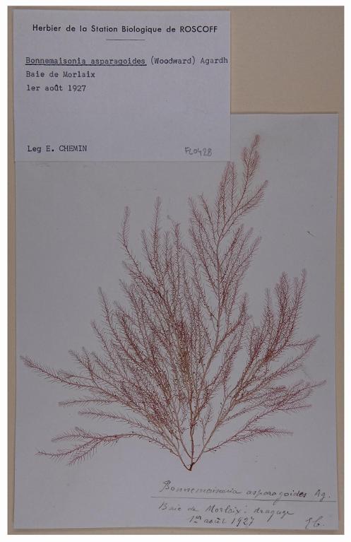 Domaine : BotaniqueCollections : Station Biologique de RoscoffFonds : CheminTypologie : HerbierIdentification du spécimen : Bonnemaisonia asparagoides
