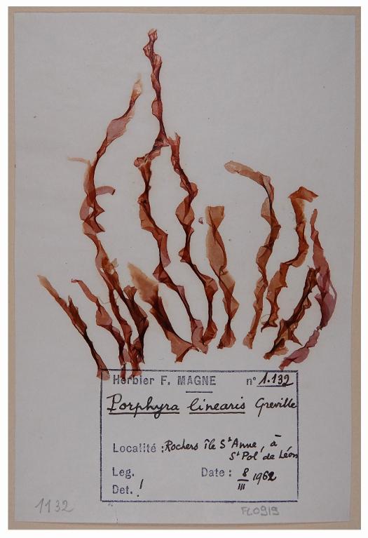 Domaine : BotaniqueFonds : MagneProvenance géographique : Saint-Pol-de-LéonIdentification du spécimen : Porphyra linearis