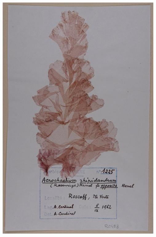Identification du spécimen : Acrochaetium rhipidandrum f. oppositaProvenance géographique : Île VerteCollections : Station Biologique de RoscoffDomaine : Botanique