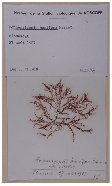 Identification du spécimen : Asparagopsis hamiferaCollections : Station Biologique de RoscoffFonds : CheminProvenance géographique : PlouescatDomaine : Botanique