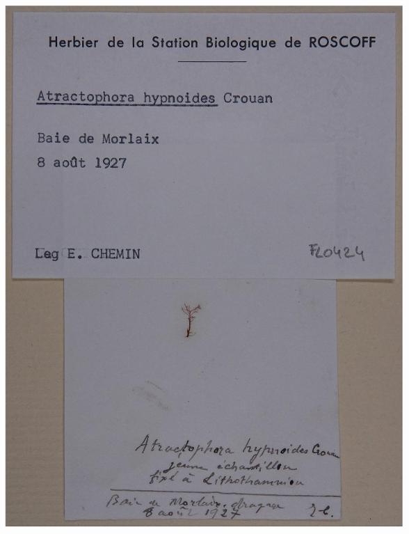 Identification du spécimen : Atractophora hypnoidesTypologie : HerbierCollections : Station Biologique de RoscoffFonds : Chemin
