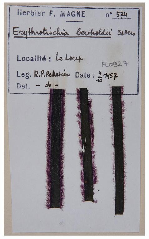 Identification du spécimen : Erythrotrichia bertholdiiDomaine : BotaniqueTypologie : HerbierProvenance géographique : Finistère