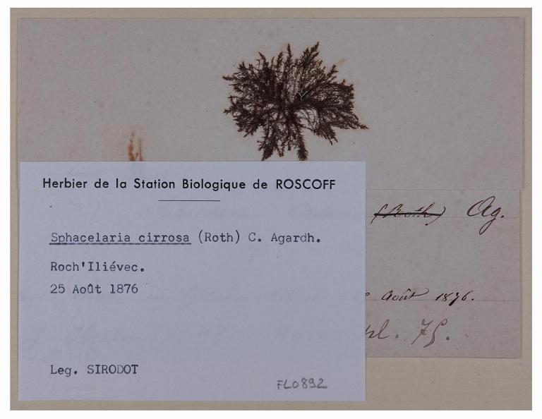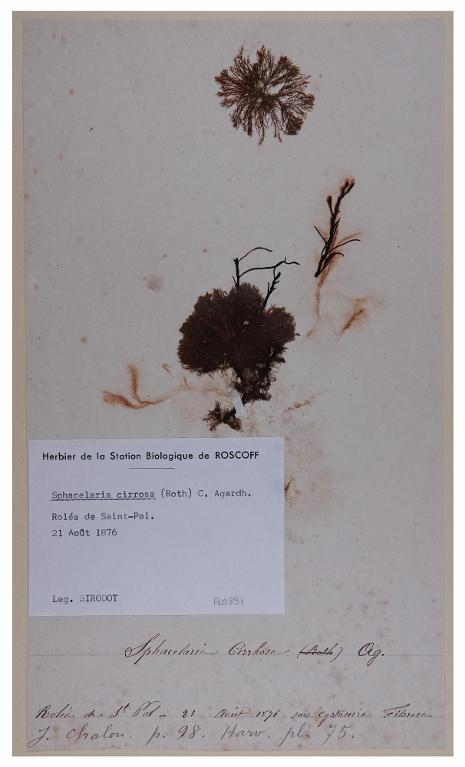 Identification du spécimen : Sphacelaria cirrosaTypologie : HerbierDomaine : BotaniqueFonds : SirodotCollections : Station Biologique de Roscoff