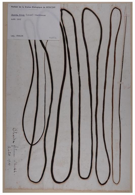 Typologie : HerbierIdentification du spécimen : Chorda filumDomaine : BotaniqueCollections : Station Biologique de Roscoff