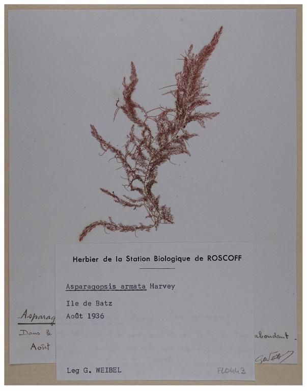Collections : Station Biologique de RoscoffIdentification du spécimen : Asparagopsis armataDomaine : BotaniqueProvenance géographique : Île de Batz